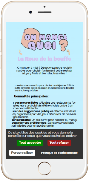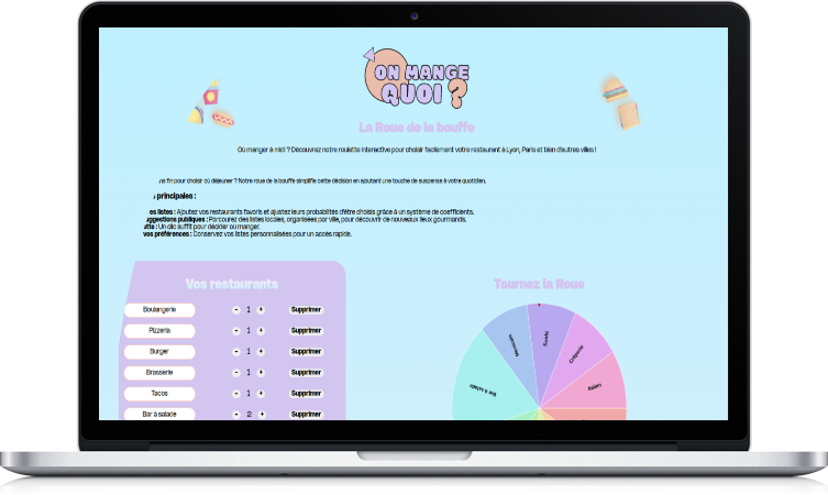 « On mange quoi » est une roulette interactive créée pour choisir facilement son restaurant. Projet ludique !